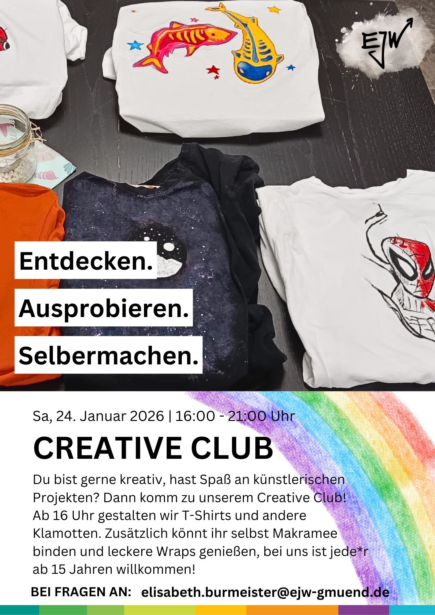 Junge Menschen treffen sich im EJW und sind gemeinsam kreativ. Kleidung bemalen oder bleichen, Makrame oder Freundschaftsbänder. Wir machen das, worauf du Lust hast.